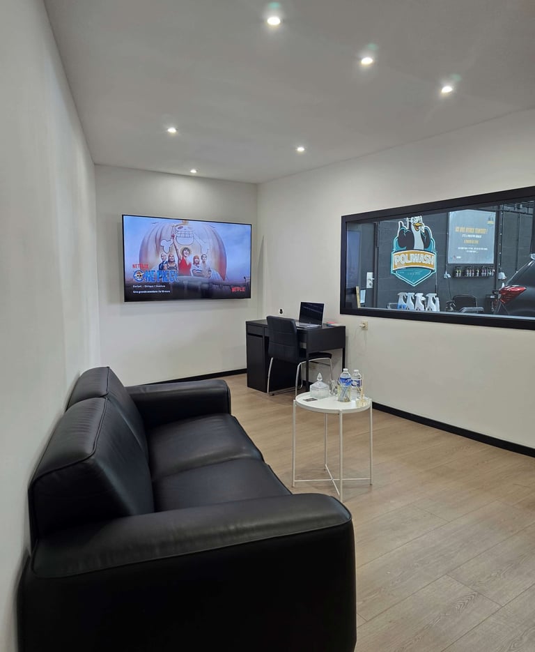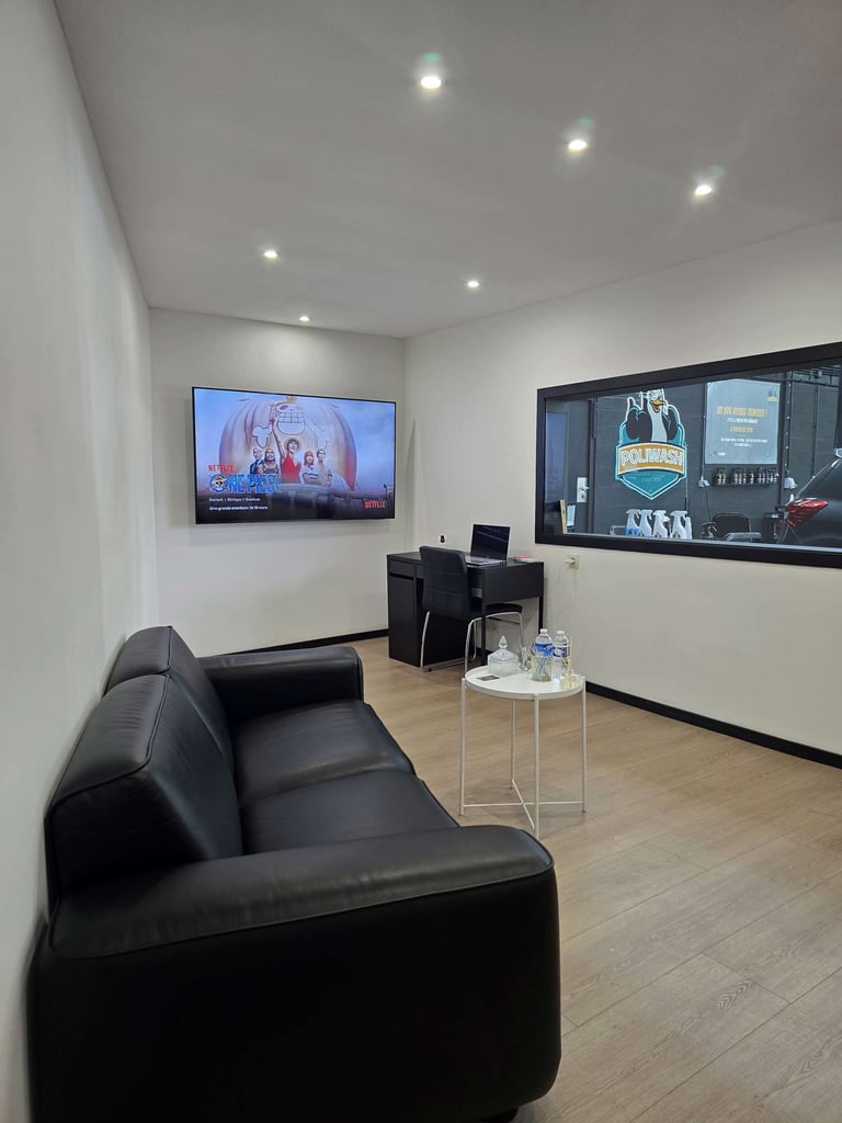 Chez Poliwash, profitez d’un espace d’attente premium avec vue directe sur l’atelier de detailing.